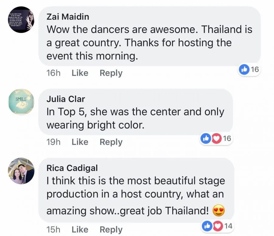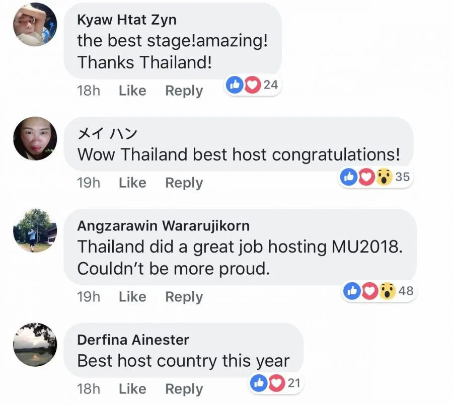 นอกจากจะได้เผยแพร่อาหาร วัฒนธรรม ที่ท่องเที่ยววัด ทะเลที่สวยงามให้ชาวโลกได้ติดตามไปแล้วผ่านการเก็บตัว ในวันประกวดจริงที่จัดขึ้นเมื่อช่วงเช้าวานนี้ 17 ธ.ค. ทำเอาทั่วโลกแห่คอมเมนต์ชื่นชมกันล้นหลามกับการจัดงานที่สวยอลังการ และมีเอกลักษณ์บ่งบอกความเป็นไทยได้เป็นอย่างดีเรียกได้ว่าเป็นอีกหนึ่งประเทศเจ้าภาพที่ดีที่สุด อาทิ ดีไซน์เวทีรูปแบบ Super X ที่ยาวที่สุดเท่าที่เคยมีมา , ดีไซน์กราฟฟิคฉากหลังต่างๆ แสง สี เสียง ทั้งบนจอ LED , ชุดไทย , การแสดงเปิดตัวที่ตื่นตาโดยมีนางรำ และ กลองสะบัดชัย นอกจากนี้ยังได้ทีมโปรดักชั่นระดับโลกที่เนรมิตเวทีออสการ์และซูเปอร์โบวล์ที่ขนอุปกรณ์ระดับมืออาชีพบินลัดฟ้าจากอเมริกามาไว้ที่เวที Miss Universe 2018บอกเลยว่ามีความยิ่งใหญ่ไม่แพ้ชาติใดที่เคยจัดมา เวทีนี้จะเป็นเวทีที่แสดงให้เห็นความสามารถในการจัดงานระดับโลกที่มีคุณภาพของคนไทยได้อย่างดีเยี่ยม