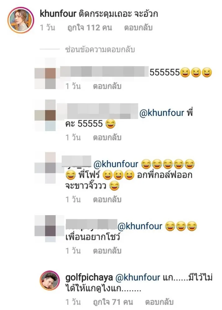 ล่าสุด กลับมีคนไม่ฟินไปกับเขาด้วยซึ่งก็คือเพื่อนสาวสุดซี้ โฟร์ ศกลรัตน์ ที่เข้ามาคอมเมนต์ว่า “ติดกระดุมเถอะ จะอ้วก” จน หนุ่มกอล์ฟ ต้องรีบตอบกลับว่า “แก…มีไว้ ไม่ได้ให้แกดูไง แก…” ซึ่ง สาวโฟร์ ก็ได้จัดกลับอีกรอบว่า “อ่อเค ๆ โทษทีปิดตาตัวเองไม่ทันอ่าาา”..