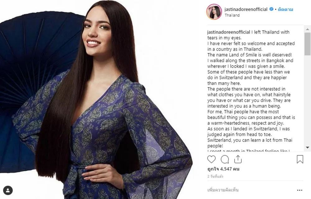 ข้อความถึงเมืองไทย!!! เจอบ้านหลังที่สองแล้ว มิสสวิสเซอร์แลนด์โพสต์ซึ้งถึงเมืองไทย สมฉายาดินแดนแห่งรอยยิ้ม