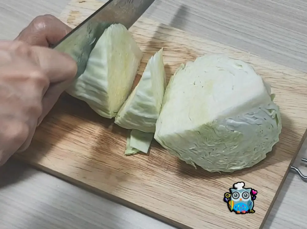 1.แช่กะหล่ำปลีทั้งหัวลงในน้ำผสมด่างทับทิม แช่ทิ้งไว้ประมาณ 20 นาที เอาขึ้นพักไว้ แล้วหั่นผ่าครึ่งเป็นชิ้นๆให้ติดกับไส้กลาง