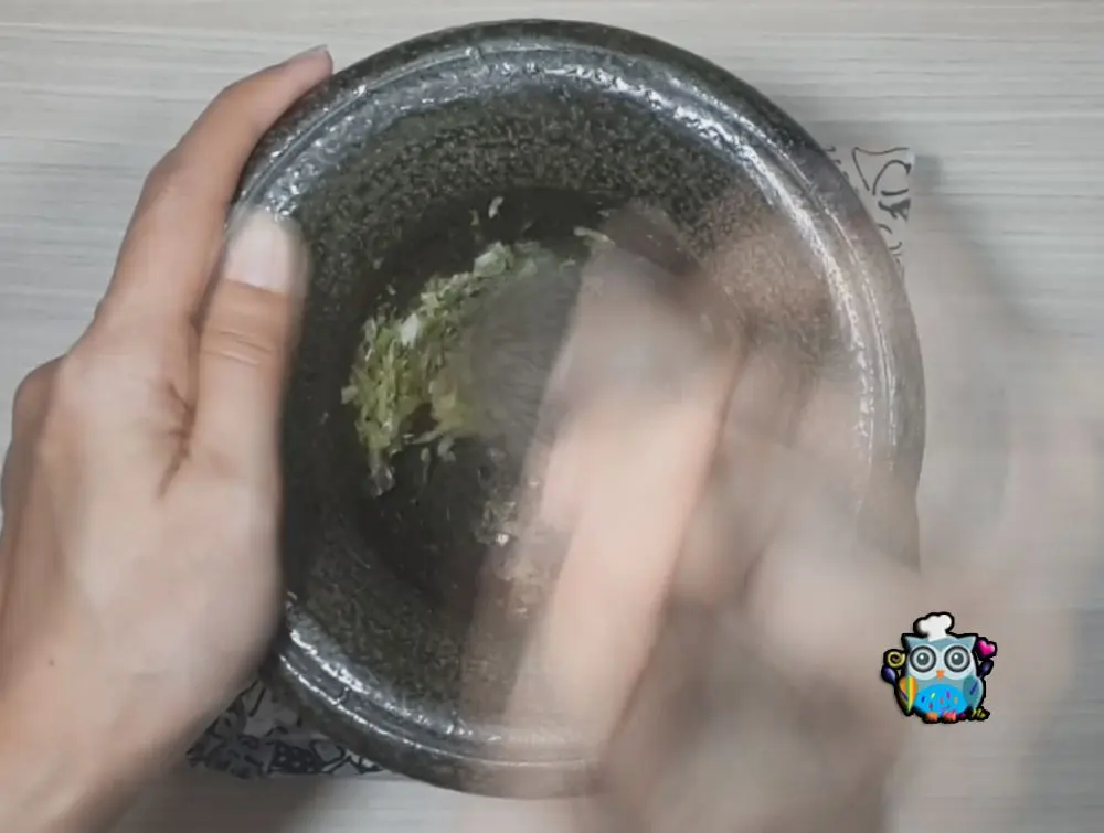 3.โขลกรากผักชี กระเทียม พริกไทย เป็นสามเกลอ