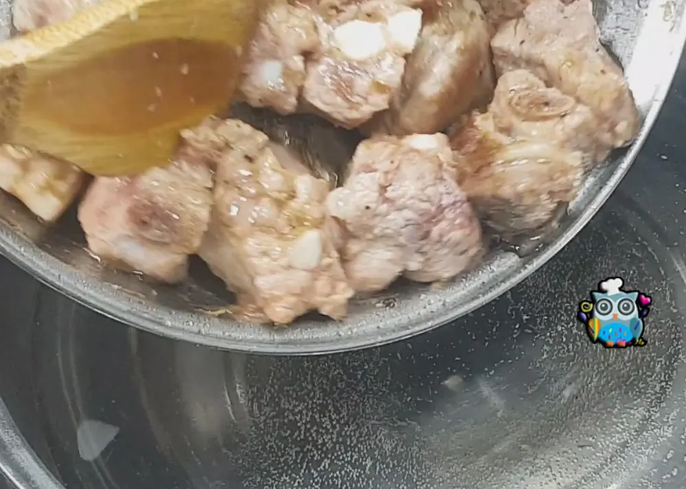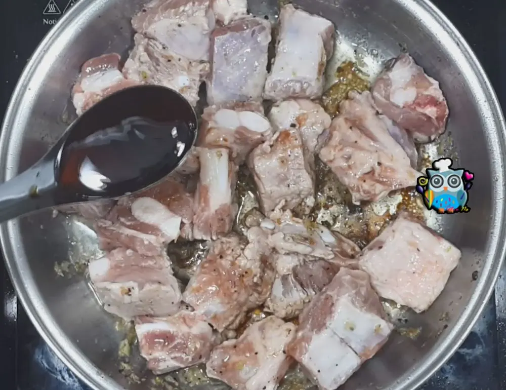 5.ใส่น้ำมันผัดกับสามเกลอจนหอม ใส่กระดูกหมูลงไปผัด