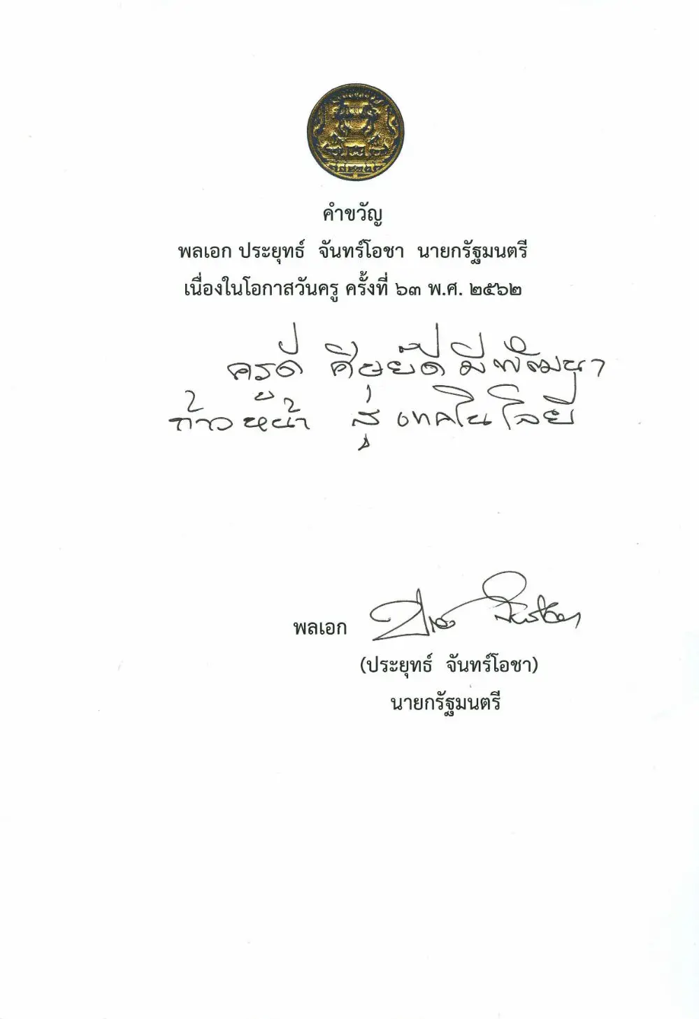 คำขวัญเนื่องในโอกาสวันครู ครั้งที่ 63 พ.ศ.2562 ของ พล.อ.ประยุทธ์ จันทร์โอชา นายกรัฐมนตรี