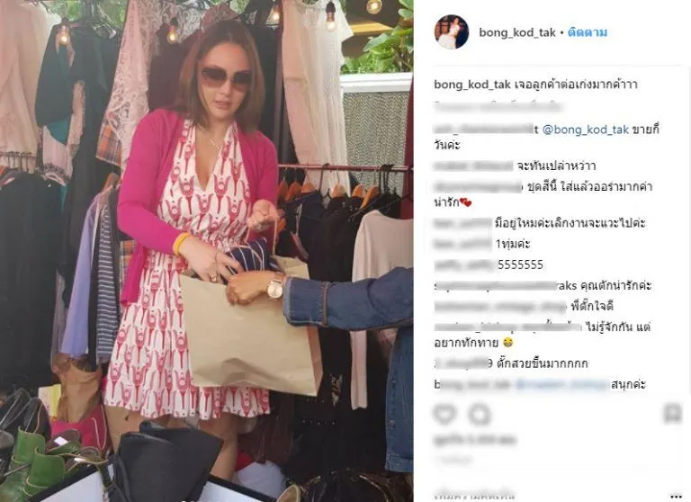 ทำให้เสื้อผ้าชุดแพงๆ รวมถึงร้องเท้าที่มีใส่ไม่ได้ เจ้าตัวจึงนำออกมาประกาศขายผ่านไอจีส่วนตัว จากชุดละ 10,000 เหลือไม่ถึงพัน ส่วนร้องเท้าหลักหมื่น ก็เหลือหลักพันเช่นเดียวกันจ้า โดยงานนี้เจ้าตัวเคยบอกเป็นอาชีพสุจริตไม่ได้เสียหายอะไร แหม!! รวยขนาดนี้ยังใช้ชีวิตแบบธรรมดา ไม่ติดหรู ไม่ติดว่าต้องเป็นผู้ดีตลอด และล่าสุดสาวตั๊ก ก็ได้นำเสื้อผ้าทั้งของตัวเองและของคุณแม่ที่ยี่ห้อหรูๆทั้งนั้นไป ลดแลกแจกแถมเป็นเสื้อผ้ามือสอง โดยสาวตั๊กตั้งใจนำเสื้อผ้าแม่มาขายเพื่อนำเงินไปทำบุญ