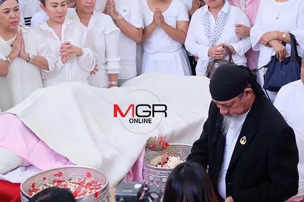จิ้ม : “ที่วันนี้เรายังใส่สีขาวกันอยู่ ก็เพราะว่าเราไปอยู่ช่วงพิธีกรรมที่ไปรับพ่อมา และช่วงรดน้ำ เราก็ยังใส่สีขาวก่อนแต่เดี๋ยวช่วงเย็นเราจะเปลี่ยนเป็นใส่สีชมพูหมด ตามที่พ่อบอกไว้ ส่วนคำสั่งเสียก็เป็นอย่างตามคลิปเลยครับ”