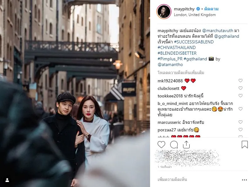 และล่าสุดนั้นสาวเมย์ก็ทำให้ต่อมจิ้นรุนแรงขึ้นไปอีก เพราะได้โพสต์ภาพควงแขนหนุ่มมาร์ช พร้อมแคปชั่นเมย์และน้อง @marchutavuth มาทำอะไรที่ลอนดอน ติดตามได้ที่ @gqthailand เร็วๆนี้ค่า
