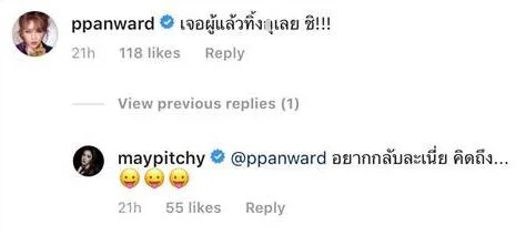งานนี้ทำเอาเพื่อนซี๊อย่าง เป้ย ปานวาด ถึงกับรีบมาคอมเมนต์แซวว่า เจอแล้วผู้แล้วทิ้ง-ูเลย ชิ!!! สาวเมย์ก็ตอบกลับมาว่า อยากจะกลับแล้ว คิดถึง