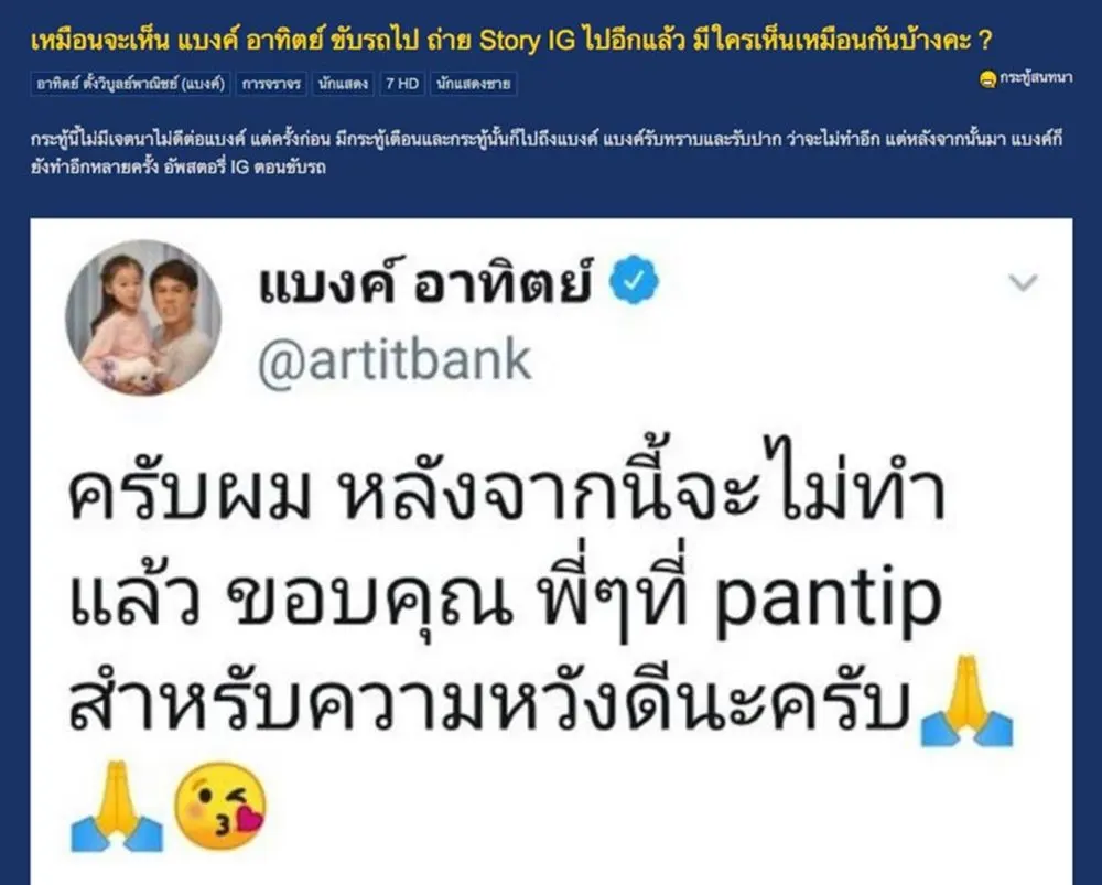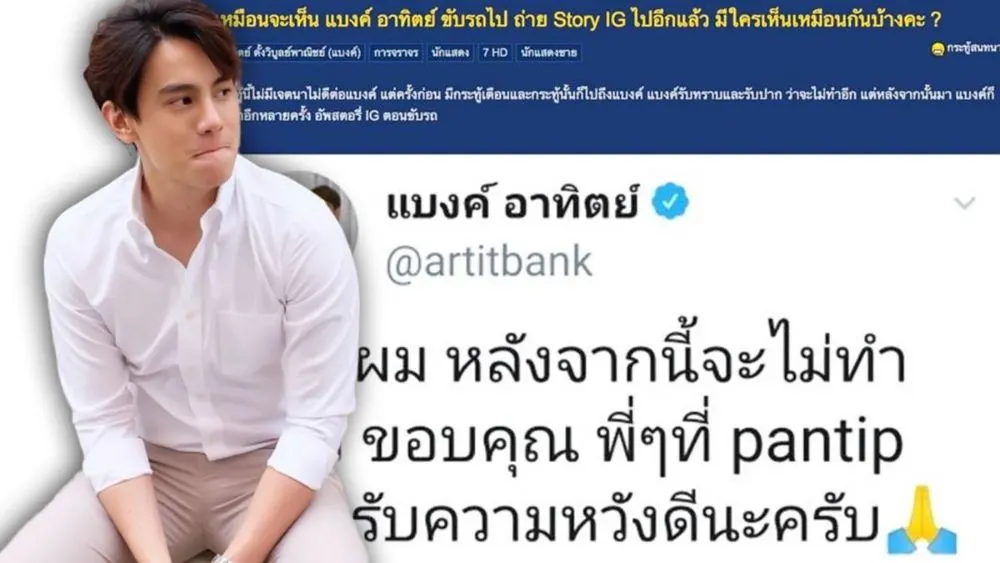 กลายเป็นกระแสที่ถูกพูดถึงอย่างมาก สำหรับกรณีของนักแสดงหนุ่ม “แบงค์ อาทิตย”ที่ถ่ายไอจีสตอรี่ในขณะขับรถเนื่องจากอันตรายอย่างมาก เพราะแค่เสี้ยววินาทีอาจจะเกิดเหตุไม่คาดคิดได้ ทั่งกับตัวเองและคนใช้รถใช้ถนนคนอื่นด้วยโดยล่าสุด “แบงค์ อาทิตย์” ได้รีบออกมาขอโทษเป็นการด่วน หลังจากที่คุณแม่มดพันธกานต์แบงค์ไว้รัชดาสมาชิกเว็บไซด์พันทิปดอทคอม ได้เผยว่า “หนุ่มแบงค์ อาทิตย์” ขับรถไป ถ่ายไอจีสตอรี่ไป และครั้งนี้ไม่ใช่ครั้งแรก เพราะครั้งก่อนมีการตั้งกระทู้เตือนสติไปแล้ว ซึ่งแบงค์ก็รับทราบ และรับปากว่าจะไม่ทำอีก แต่ไป ๆ มา ๆ กลับกลายเป็นว่า แบงค์กลับมาถ่ายไอจีสตอรี่ในขณะขับรถด้านแบงค์เอง ก็ได้ออกมาโพสต์ข้อความผ่านทวิตเตอร์ว่า ตนเองหมดคำแก้ตัวว่าผิดเพราะความเผลอ แต่ก็ขอบคุณทุกคนที่เตือนด้วยความเป็นห่วง