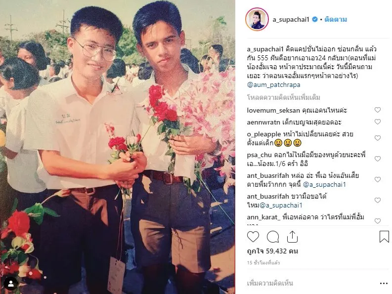 ล่าสุดพี่เอได้จัดให้ ด้วยการพลีชีพ ลงทุนโพสต์ภาพสมัยตอนเป็นนักเรียน พร้อมแคปชั่น คิดแคปชั่นไม่ออก ซ่อนกลิ่น แล้วกัน 555 ฝันดีอยากเอาเอว24 กลับมา(ตอนที่แม่น้องอั้มเจอ หน้าตาประมาณนี้ค่ะ วันนี้มีคนถามเยอะ ว่าตอนเจออั้มแรกๆหน้าตาอย่างไร) @aum_patchrapa เรียกได้ว่าหล่อเหมือนกันนะเนี่ย มิน่าแหละ อั้ม ถึงคิดว่าจะเข้ามาจีบ555