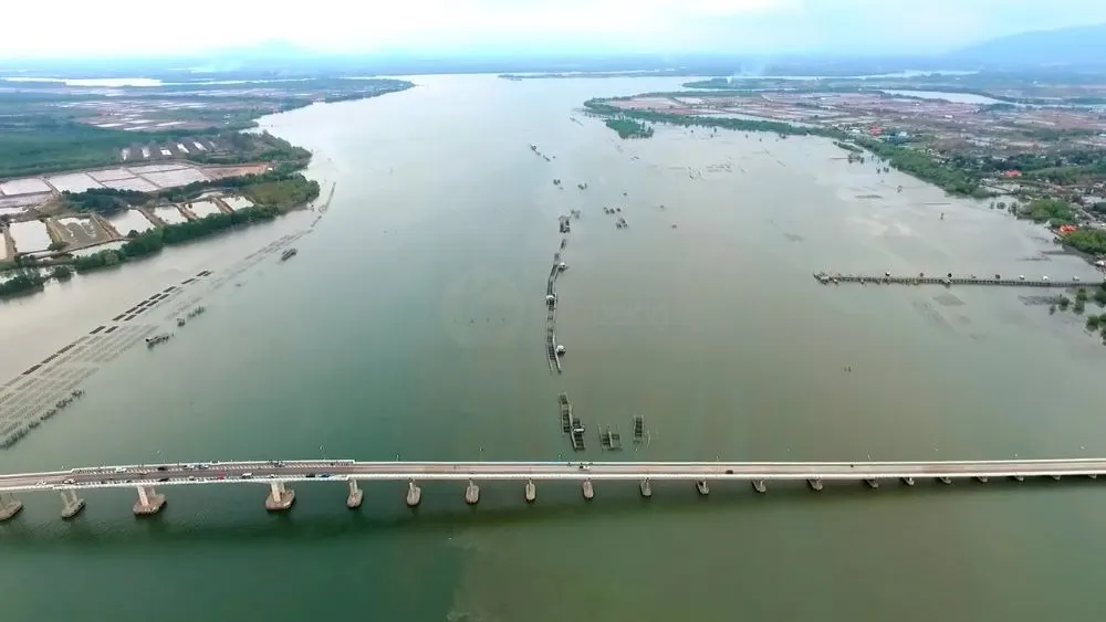 ในส่วนของบริเวณกลางสะพาน มีทางเบี่ยงสำหรับจอดรถให้เราได้ชมวิวทิวทัศน์อีกด้วย ถ้าเรามองออกไปจะเห็นวิวที่สวยงามของปากแม่น้ำจันทบุรีและท่าเรือน้ำลึก อีกด้านหนึ่งเราจะเห็นกระชังปลามากมาย ให้ได้เห็นถึงวิถีชีวิตการทำประมงของชาวบ้านแหลมสิงห์ครับ ถ้าใครมาช่วงเช้า หรือช่วงเย็นๆ ก็จะได้รับลมทะเลเย็นสบาย อากาศสดชื่นมากครับ สูดอากาศกันได้เต็มปอดเลยทีเดียวครับ