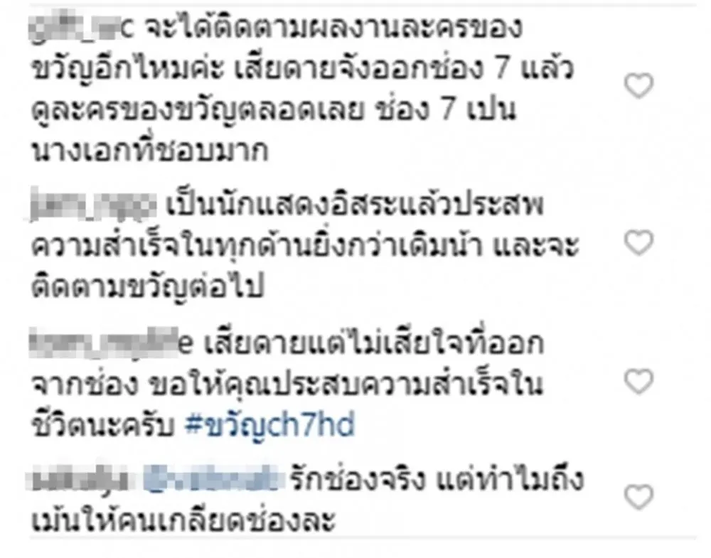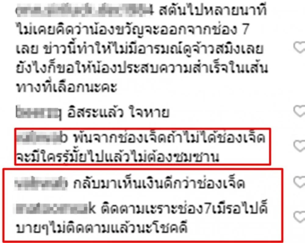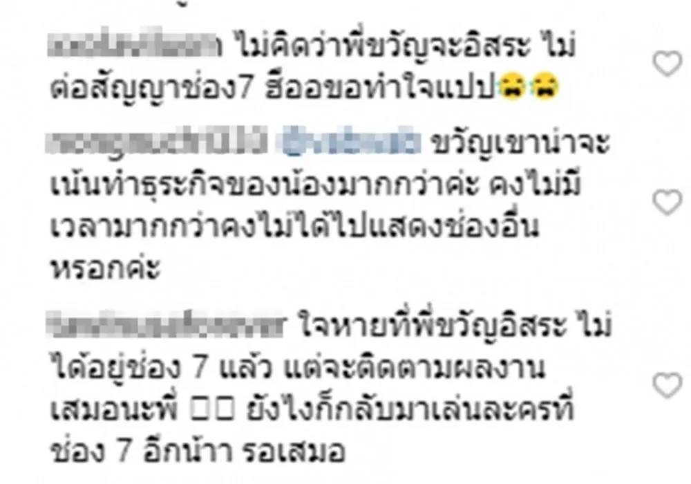 ส่องความเคลื่อนไหว ขวัญ อุษามณี และ ปุ๊กลุ๊ก ฝนทิพย์ หลังข่าวลือ ไม่ต่อสัญญากับวิกหมอชิต ช่อง 7 สี ได้รับการยืนยันและคอนเฟิร์มจากทางผู้ใหญ่ช่อง7เอง ซึ่งฟีดแบคก็เป็นไปตามคาด เมื่อ มีแฟนๆวิกหมอชิตออกมาคอมเม้นถล่มในIGของสาวขวัญแบบเละเทะ!! ทั้งผิดหวัง,ทำใจไม่ได้ และร้ายแรงกว่าถึงขั้นที่เอ่ยปากว่า สาวขวัญเนรคุณ , แต่ถึงคำด่าจะเยอะแต่คนที่เข้าใจและเคารพการตัดสินใจครั้งนี้ของขวัญก็มีเช่นกัน โดยเข้ามาคอมเม้นส่งกำลังใจให้และยืนยันว่าแม้ขวัญจะไปเล่นละครและมีผลงานกับช่องไหน ก็ยังจะตามไปดูเช่นเคย ในส่วนของสาวปุ๊กลุ๊กนั้น ทันทีที่มีประกาศอย่างเป็นทางการจากวิกหมอชิต เธอก็ตั้งอินสตราแกรมเป็นส่วนตัวทันที