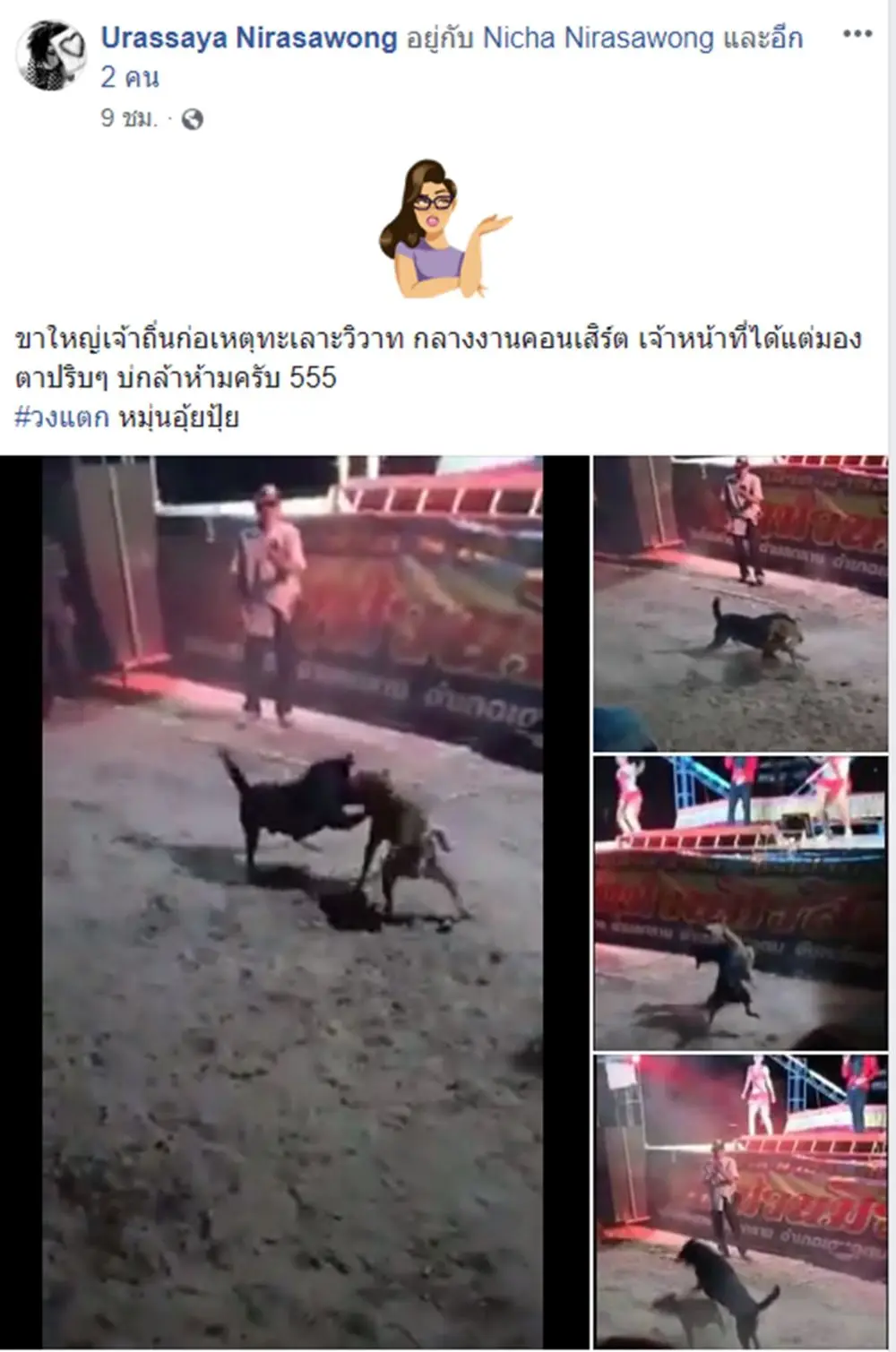 โดยทางเพจ "Urassaya Nirasawong" ได้ระบุข้อความไว้ว่า "ขาใหญ่เจ้าถิ่นก่อเหตุทะเลาะวิวาท กลางงานคอนเสิร์ต เจ้าหน้าที่ อาสาได้แต่มองตาปริบๆ บ่กล้าห้ามครับ 555 วงแตกหมุ่นอุ้ยปุ้ย"