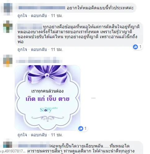 นับว่าเรื่องราวดังกล่าว ได้สร้างความซาบซึ้ง และประทับใจให้กับผู้ที่เข้ามาอ่านอย่างมาก ทั้งนี้ชาวโซเชียลยังชื่นชมด้วยว่า เป็นคุณหมอที่ดี ทำหน้าที่อย่างเต็มที่ เพื่อให้ทั้งลูกๆ และผู้ป่วยได้มีความสุขทั้งสองฝ่าย ลูกๆ ไม่ต้องทุ่มเงินรักษา ทั้งที่อาการป่วยของแม่อาจจะไม่ดีขึ้นเลย