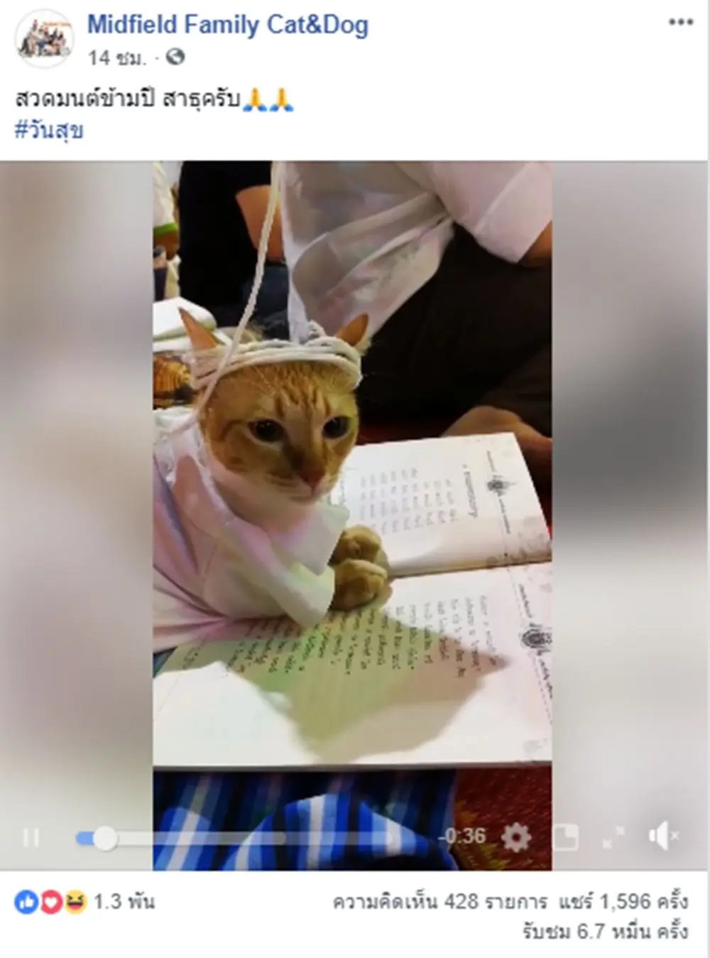 เมื่อวานที่ผ่านมาเป็นวันปีใหม่ เทศกาลที่ทุกคนต่างรอคอบและออกมาเพื่อเฉลิมฉลองกันอย่างมากมาย และบางคนก็ออกไปสวดมนต์ข้ามปีตามวัดใกล้บ้าน ซึ่งวันนี้มีเรื่องราวน่ารักมาให้ชม ทำให้ทุกคนได้ยิ้มตามสำหรับผู้ที่ได้พบเห็นและชาวเน็ต เมื่อเจ้าของได้พาเจ้าเหมียวไปทำบุญที่วัด ไปสวดมนต์ข้ามปี เมื่อวานที่ (31 ธ.ค.) เป็นเทศกาลปีใหม่ที่ทุกคนต่างออกไปเแลิมฉลอง บางคนก็กลับบ้านต่างจังหวัด บางคนก็ออกไปเที่ยวในวันหยุดยาวส่งท้ายปี และบางคนก็ออกไปสวดมนต์ข้ามปี เพื่อป็นศิริมงคลให้กับตัวเองในวันปีใหม่ เจ้าเหมียวตัวนี้ก็เช่นกัน เมื่อเจ้าของได้พาเจ้าเหมียวสีส้ม ใส่ชุดขาวมานั่งสวดมนต์ข้ามปีด้วย จึงเป็นที่สนใจให้แก่ผู้ที่พบเห็นเป็นอย่างมาก จากเจ้าของเฟชบุ๊ก "Midfield Family Cat&Dog" ได้โพสต์คลิปสุดน่ารักแมวเหมียวมานั่งสวดมนต์ข้ามปี พร้อมระบุข้อความไว้ว่า "สวดมนต์ข้ามปี สาธุครับ#วันสุข" ทั้งนี้จากคลิปที่ได้ถูกแชร์ออกไป ทำให้มีคนเข้ามาดูมากถึง 6.7 หมื่นครั้งแค่ไม่กี่ชั่วโมง แชร์อีกมากกว่า1.5 พันครั้ง นอกจากนี้ชาวเน็ตก็ได้เข้ามาแสดงความคิดเห็นอย่างมากมาย ซึ่งส่วนใหญ่ก็ได้ชื่นชอบ และชมความน่ารักของเจ้าเหมียวตัวนี้