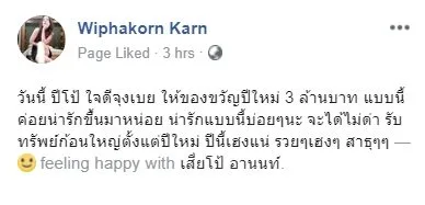 ล่าสุดก็มีเซอร์ไพรส์อีกแล้ว เมื่อกานต์ ได้โพสต์ภาพลงเฟซบุ๊ก เป็นรูปที่ถ่ายรูปกับเสี่ยโป้ พร้อมบอกว่า “วันนี้ ปีโป้ ใจดีจุงเบย ให้ของขวัญปีใหม่ 3 ล้านบาท แบบนี้ค่อยน่ารักขึ้นมาหน่อย น่ารักแบบนี้บ่อยๆ นะ จะได้ไม่ด่า รับทรัพย์ก้อนใหญ่ตั้งแต่ปีใหม่ ปีนี้เฮงแน่ รวยๆเฮงๆ สาธุๆ”