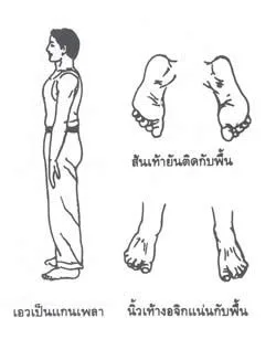 1. ยืนตรงตัว เข่าไม่งอ แยกเท้าทั้งสองข้างออกจากกัน โดยมีระยะห่างประมาณความกว้างหัวไหล่