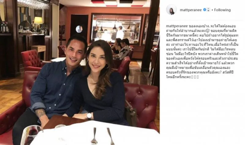 “ขอลงเองบ้าง..จะได้ไม่ต้องแอบถ่ายกันให้ลำบากแล้วนะคะ ขอบคุณที่ตามติดชีวิตกันมากขนาดนี้ค่ะ ต่อไปถ้าอยากได้รูปคู่แมทและพี่สงกรานต์ไว้เอาไปลงเข้ามาขอถ่ายได้เลยค่ะ เราทำอะไร,ทานอะไร,ที่ไหน,เมื่อไหร่เราก็เป็นแบบนั้นค่ะ เราใช้ชีวิตกันปกติ ไม่ได้มีอะไรหลบซ่อน ไม่มีอะไรปิดบัง พวกเราต่างเดินหน้าใช้ชีวิตของตัวเองเพื่อหวังให้ครอบครัวและตัวเราประสบความสำเร็จได้อย่างที่ตั้งเป้าหมายไว้ แล้วพวกคุณมีเป้าหมายเพื่อขับเคลื่อนตัวคุณเองและครอบครัวที่รักของพวกคุณหรือยังคะ? สวัสดีปีใหม่อีกครั้งนะคะ”