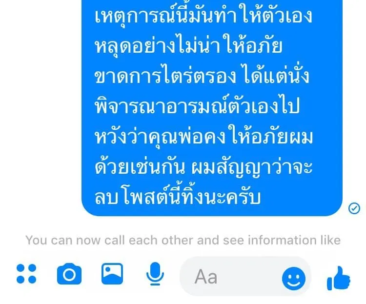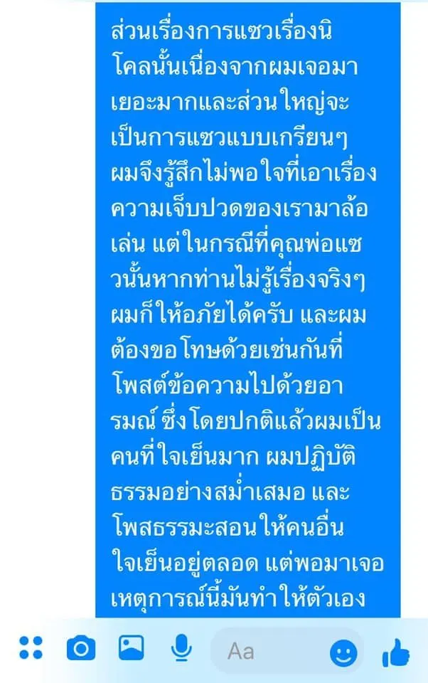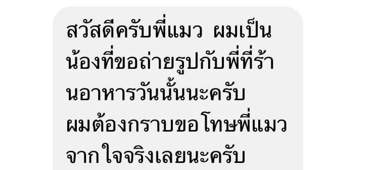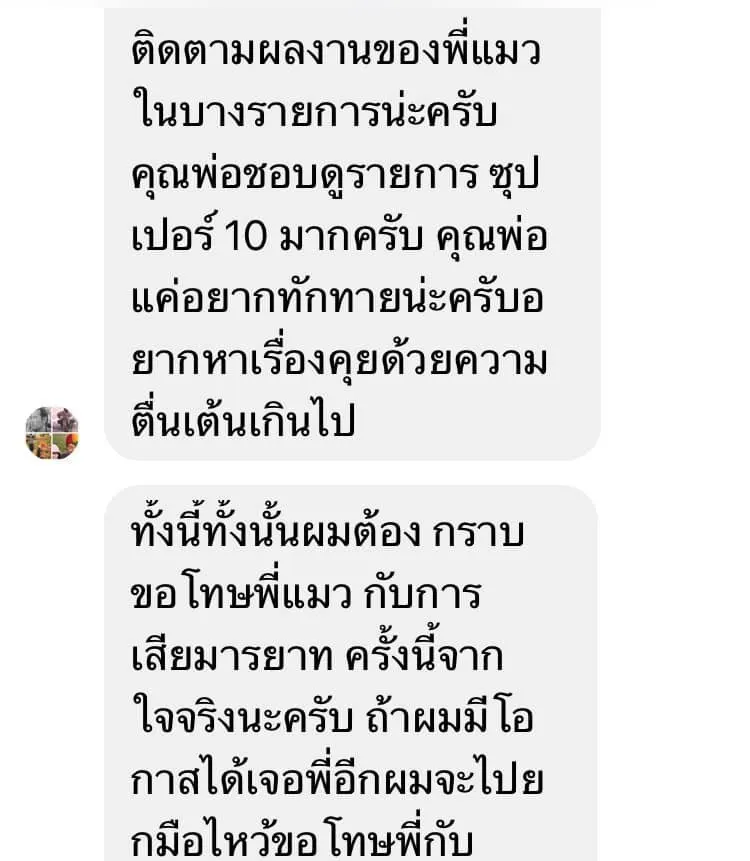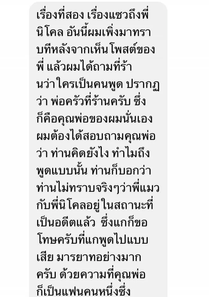 ล่าสุด ทางแฟนคลับคนดังกล่าว ได้เข้ามาขอโทษและชี้แจงผ่านทางแชทเฟซบุ๊กแล้ว โดย แมว ได้แคปเจอร์หน้าจอ และระบุว่า "มีการเข้ามาชี้แจงต่อเหตุการณ์ที่ผมโพสต์ไปก่อนหน้านะครับ และได้ขอโทษกันแล้ว ให้อภัยแล้ว และผมก็ต้องขอโทษด้วยที่วู่วาม"