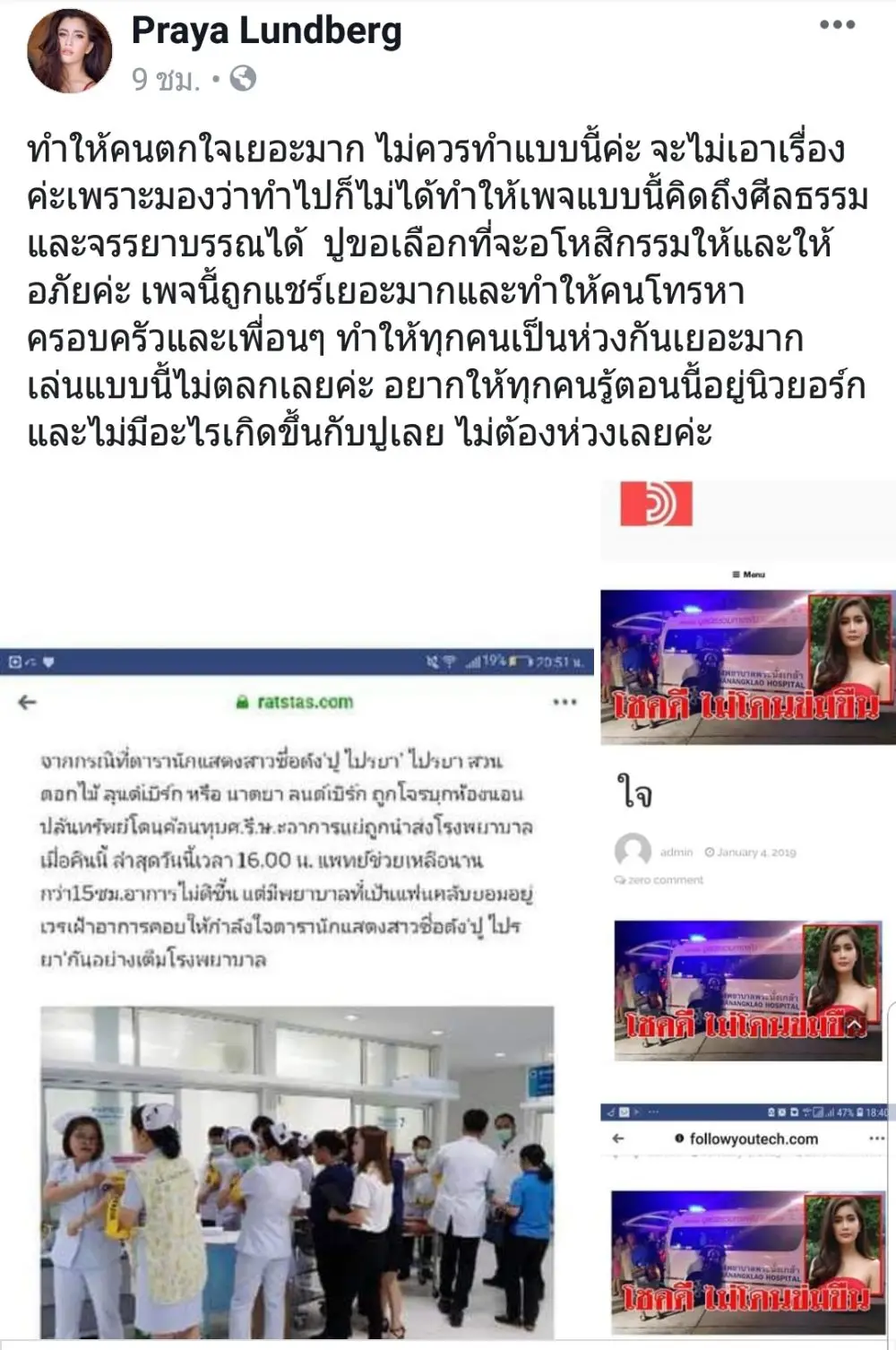 หลังมีเว็ปไซต์ชื่อดังพาดหัวข่าว ปู ไปรยา โดนทุบหัวชิงทรัพย์ แต่ล่าสุดสาวปู ไปรยา ก็ได้โพสต์ใน แฟนเพจ praya lundberg ว่า