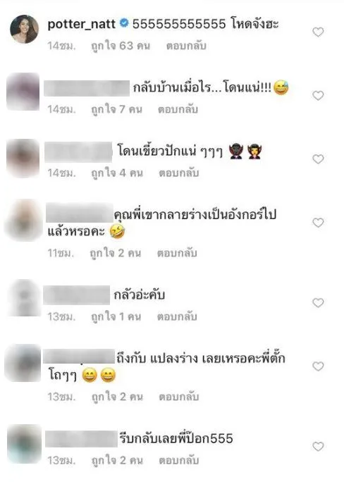 และเล่าว่า แค่เถลไถลก่อนกลับบ้านนิดหน่อย สามีเลยส่งรูปนี้มาให้ โถ่ๆๆๆๆๆ ทำเอานักแสดงสาว แนท อนิพรณ์ โผล่แซวเลยว่า โหดจังฮะ และงานนี้แฟนคลับก็เข้ามาคอมเม้นท์สนั่นเลยว่ารีบกลับบ้านด่วนเลย 5555 หยอกล้อกันเป็นหนุ่มสาวจริงๆคู่นี้
