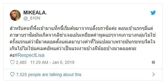 ทำให้เหล่าแฟนคลับของวง BLACKPINK และของลิซ่า ซึ่งมีอยู่ทั่วโลก เห็นคอมเมนต์แบบนี้แล้ว สุดจะทน พากันออกมาปกป้อง ลิซ่า ผ่านแฮชแท็ก #RespectLisa ทั้งเป็นคลิปขณะ ลิซ่ากำลังน้ำตาไหลและภาพนิ่ง จนกลายเป็นกระแสไวรัลในโลกออนไลน์ จนติดเทรนด์อันดับต้นๆ ของทวิตเตอร์ประเทศไทย
