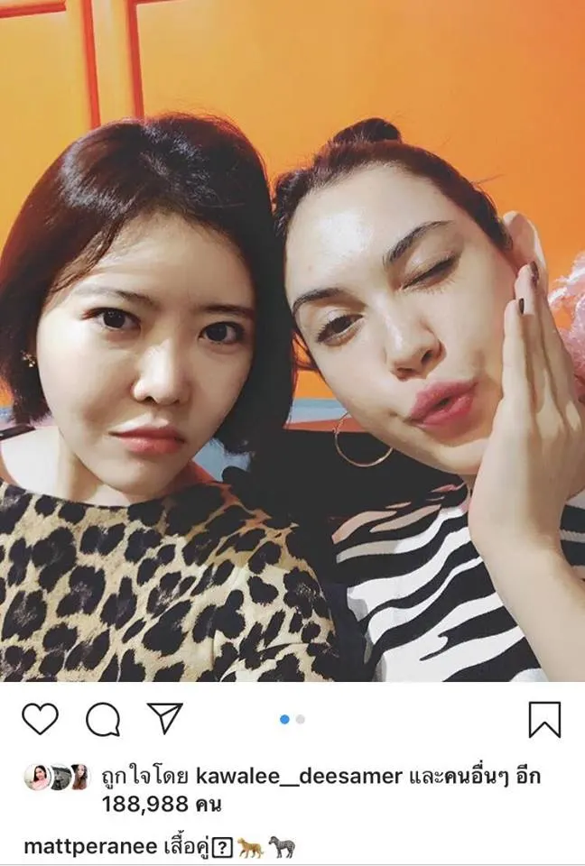 ออกมาเปิดปากยอมรับว่ากำลังศึกษาดูใจอยู่กับนางเอกช่อง 3 แมท ภีรนีย์ แม้จะยังไม่ถึงขั้นแฟนแต่ก็จริงจังมาก จากที่ชาวเน็ตวิพากษ์วิจารณ์กันอย่างมากมายอยู่แล้วก็ยิ่งกระหน่ำเข้าไปใหญ่ เพราะหลายคนคิดว่าสาวแมทเป็นมือที่ 3 ทำความรักของ แอฟ-สงกรานต์ ต้องพังลง! ล่าสุดไอจีส่วนตัวของ แมท ภีรนีย์ ก็ได้โพสต์รูปคู่ของเพื่อน เป็นรูปใส่เสื้อลายสัตว์ แคปชั่นว่าเสื้อคู่