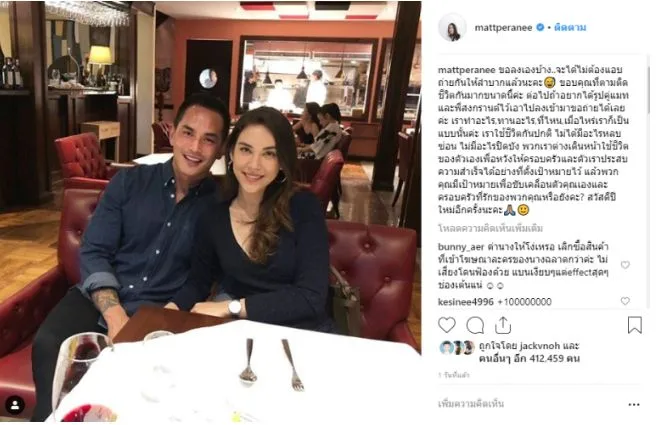 “ขอลงเองบ้าง..จะได้ไม่ต้องแอบถ่ายกันให้ลำบากแล้วนะคะ ขอบคุณที่ตามติดชีวิตกันมากขนาดนี้ค่ะ ต่อไปถ้าอยากได้รูปคู่แมทและพี่สงกรานต์ไว้เอาไปลง เข้ามาขอถ่ายได้เลยค่ะ เราทำอะไร,ทานอะไร,ที่ไหน,เมื่อไหร่ เราก็เป็นแบบนั้นค่ะ เราใช้ชีวิตกันปกติ ไม่ได้มีอะไรหลบซ่อน ไม่มีอะไรปิดบัง พวกเราต่างเดินหน้าใช้ชีวิตของตัวเองเพื่อหวังให้ครอบครัวและตัวเราประสบความสำเร็จได้อย่างที่ตั้งเป้าหมายไว้ แล้วพวกคุณมีเป้าหมายเพื่อขับเคลื่อนตัวคุณเองและครอบครัวที่รักของพวกคุณหรือยังคะ? สวัสดีปีใหม่อีกครั้งนะคะ จนทำเอาดราม่าสนั่นอีกรอบ แถมชาวเน็ตได้ออกมาจับผิดภาพที่ก่อนหน้าทั้งคู่จะเปิดตัว สงกรานต์ได้มีการโพสต์โปรโมทสถานที่ร้านอาหารของตนเอง ซึ่งก็มีแขนนางแบบที่ใส่นาฬิกาเหมือนกับแมท ภีรนีย์ จนกลายเป็นเรื่องร้อนฉ่าว่าทั้งคู่แอบเจอกันก่อนที่จะเปิดตัวหรือเปล่า