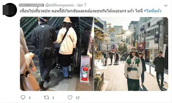 เท่านั้นยังไม่พอ มีคนตาดีเห็นว่าทั้งแก้วและโทนี่ ยังแอบจูงมือกันขึ้นบันไดเลื่อนที่ญี่ปุ่นอีก โดยมีภาพแจ็กเก็ตของแก้วยืนยัน แหมๆๆ แบบนี้ไม่ใช่เพื่อนละมั้งจ่ะ ยังไงต้องรอเจ้าตัวคอนเฟิร์มสถานะอีกทีน่ะจ้ะ