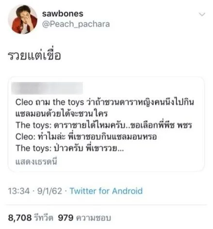 เป็นเรื่องราวความน่ารักที่ทำชาวเน็ตขำหนักมาก สำหรับ กรณีที่นักร้องหนุ่มสุดติสท์ ทอย ธันวา หรือ The toys ให้สัมภาษณ์กับทาง Cleo ในคำถามที่ว่า ถ้าชวนดาราหญิงคนหนึ่งไปกินแซลมอนด้วยได้จะชวนใคร ? ซึ่งทอยก็เลือกเป็นดาราผู้ชาย และคนๆนั้นก็คือหนุ่ม พีช พชร ทายาทตระกูลเซ็นทรัลด้วยเหตุผลว่า เพราะว่าพี่เขารวย จะได้ให้เขาเลี้ยง เราไม่ต้องจ่าย