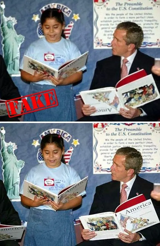 ภาพดับเบิ้ลยูบุชอ่านหนังสือเล่มกลับหัว ไม่ได้เป็นที่ฮือฮาเฉพาะในโลกอินเทอร์เน็ต แต่สื่อมวลชนก็ใช้ภาพนี้ให้เป็นโจมตีประธานาธิบดีสหรัฐฯ อย่างไรก็ตาม ท่ามกลางความวุ่นวาย ก็มีภาพของบุชที่กำลังถือหนังสืออย่างถูกต้องปรากฏขึ้นอย่างไร้ที่มา จึงได้รับการยืนยันว่าภาพอ่านหนังสือกลับหัวเป็นภาพตัดต่อ
