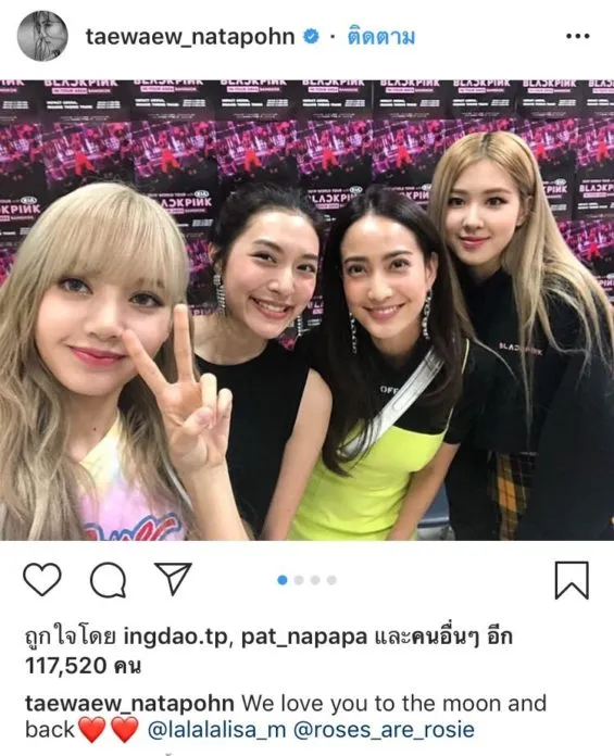 โดย แต้ว ได้โพสต์ภาพที่ถ่ายร่วมกับ ลิซ่า ลงในอินสตาแกรม พร้อมแคปชั่นว่า “We love you to the moon and back”
