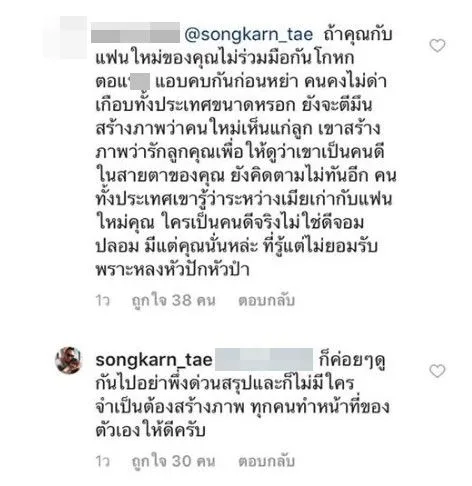 ชาวเน็ต : ถ้าคุณกับแฟนใหม่ของคุณไม่ร่วมมือกันโกหก ตอแxx แอบคบกันก่อนหย่า คนคงไม่ด่าเกือบทั้งประเทศขนาดหรอก ยังจะตีมึนสร้างภาพว่าคนใหม่เห็นแก่ลูก เขาสร้างภาพว่ารักลูกคุณเพื่อให้ดูว่าเขาเป็นคนดีในสายตาของคุณยังคิดตามไม่ทันอีก คนทั้งประเทศเขารู้ว่าระหว่างเมียเก่ากับแฟนใหม่คุณ ใครเป็นคนดีจริงไม่ใช่ดีจอมปลอม มีแต่คุณนั่นหล่ะ ที่รู้แต่ไม่ยอมรับ พราะหลงหัวปักหัวปำ // สงกรานต์ : ก็ค่อยๆดูกันไปอย่าพึ่งด่วนสรุปและก็ไม่มีใครจำเป็นต้องสร้างภาพ ทุกคนทำหน้าที่ของตัวเองให้ดีครับ