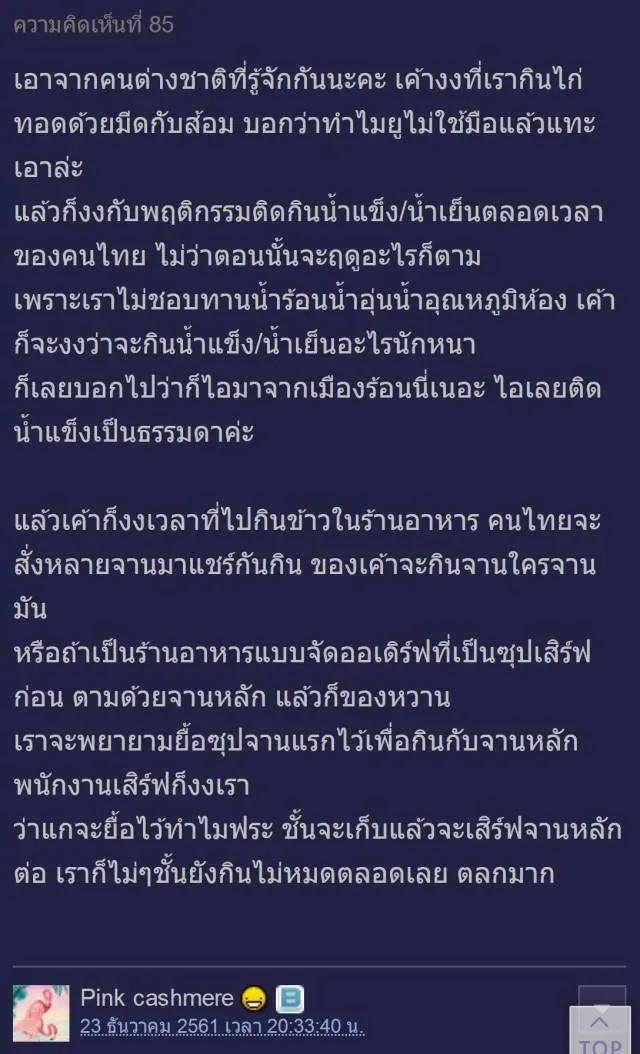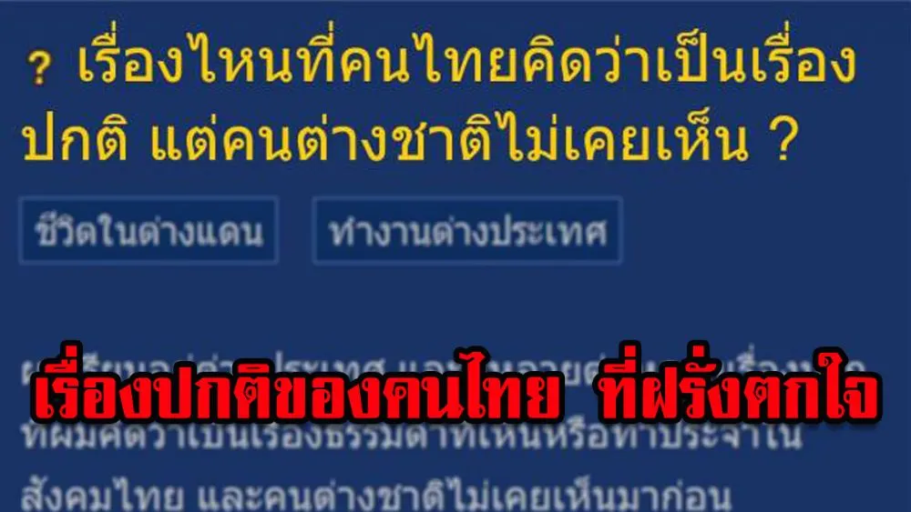 สำหรับวันนี้เราขอนำเสนอเรื่องราวที่สมาชิกหมายเลข 5003434 ในเว็บพันทิปได้เปิดประเด็นเอาไว้ เพื่อให้คนไทยเข้ามาแชร์ข้อมูลในหัวข้อ “สิ่งใดที่ไทยทำปกติ แต่ชาติอื่นไม่ทำ” จะมีเรื่องอะไรบ้างไปดูกันเลย