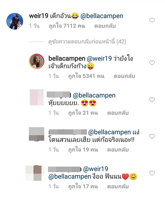 ที่ล่าสุด ในเทศกาลวันเด็กสาวเบลล่า ก็ได้นำภาพวัยเด็กมาโพสต์ลงอินสตาแกรม งานนี้พี่เวียร์ของเราก็เข้ามาคอมเม้นท์แซวว่า เด็กอ้วน ทำเอาสาวเบลล่าสวนกลับเลยว่า “ว่ายังไง เจ้าเด็กเก้งก้าง” ทำเอาแฟนคลับขำลั่น 555 แซวมาเจอแซวกับ เหล่าแฟนคลับก็ฟินส์กันสุดๆ แซวน้อง เจอน้องแซวกลับซะเลย บอกเลยคู่นี้หวานกันทุกเทศกาลจริงๆจร้า