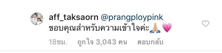 โดยปกติแล้วนั้น แอฟ มักจะไม่ค่อยออกมาตอบคอมเม้นท์แฟนคลับที่เข้ามาเม้นท์ถึงอดีตสามีสักเท่าไหร่ แต่ล่าสุดนั้น แอฟ ได้โพสต์เดินแบบครั้งแรกของน้องปีใหม่ และก็ได้มีแฟนคลับคนนึงได้เข้ามาคอมเม้นท์ถึงเรื่องราวของทั้งคู่ จน แอฟ ตอบกลับไปว่า “ขอบคุณที่เข้าใจนะคะ” ยอมรับให้ความหัวใจแกร่งดั่งหินผาของเธอจริงๆ
