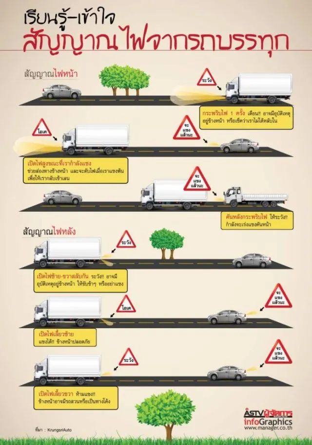 ในกรณีที่เราวิ่งสวนทางกับรถบรรทุก แล้วสิบล้อส่งสัญญาณไฟโดยดับไฟหน้าและเปิดขึ้น แสดงว่าเขากำลังบอกว่าทางข้างหน้ามีด่าน หรืออุบัติเหตุรุนแรงให้ชะลอความเร็ว คาดเข็มขัดนิรภัย หรือให้เราเตรียมความพร้อมกับเหตุการณ์ข้างหน้าด้วย