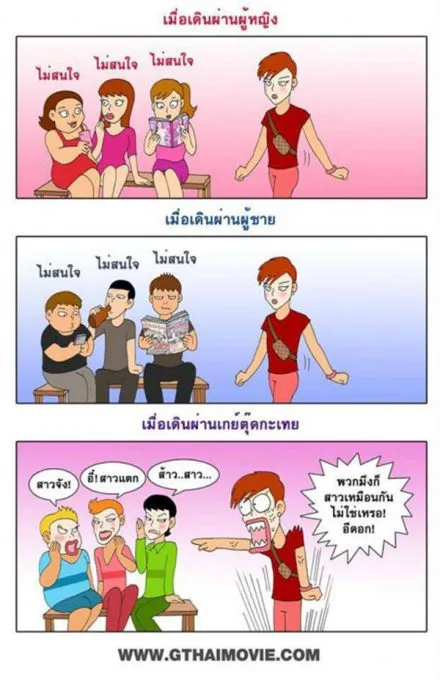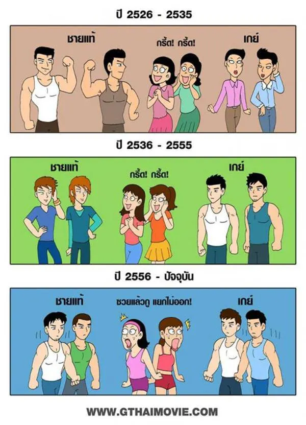 ยุคนี้มันต้องจิกกัดและมันส์ฮา มาดูรูปจิกกัดสังคมแบบฮาๆ ที่มาจากเพจดังในเฟซบุ๊ก Gthai movie เกย์เว้ยเฮ้ย ซึ่งได้ทำภาพล้อเลียนเรื่องราวเหตุการณ์จริงในสังคมไทย นำเสนอผ่านภาพการ์ตูนเเละข้อความไม่กี่ประโยค เเต่สามารถสร้างความฮาได้เป็นอย่างดี เเถมดูเเล้วยังต้องบอกว่านี่มันเรื่องจริงที่เกิดขึ้นในสังคมไทยชัดๆ ว่าเเล้วมาดูกันเลย