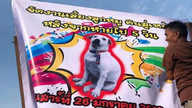 กลายเป็นภาพที่เหล่าบรรดาคนรักสัตว์ฮือฮาและเอ็นดูอย่างแรง สำหรับการติดป้ายประกาศเลี้ยงโต๊ะจีน ของเจ้าของที่จอดรถ หลังจากบนบานตั้งจิตเอาไว้ว่า ถ้าสุนัขตัวโปรดกลับมาจะจัดงานดังกล่าว