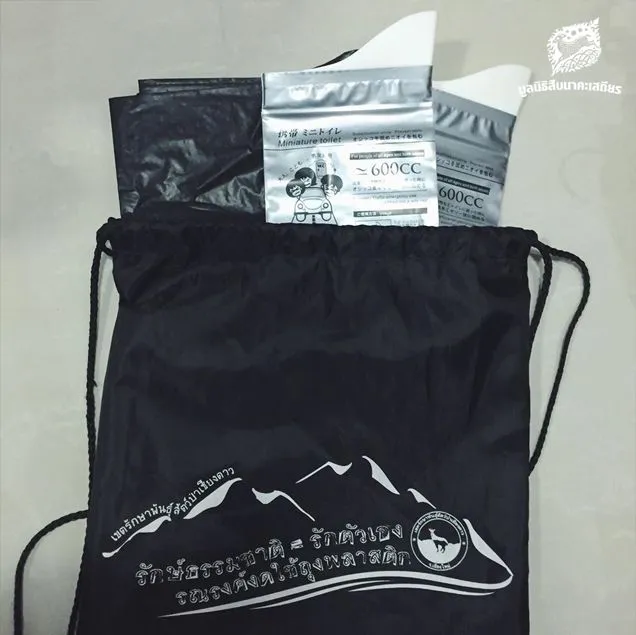 ในส่วนของถุงปัสสาวะ จะมีผงให้ใส่ลงไปในถุงเมื่อเราทำธุระเสร็จแล้ว โดยเจ้าผงนี้จะทำให้ของเหลวกลายจับตัวเป็นวุ้น (นักท่องเที่ยวกลุ่มหนึ่งเรียกว่าการทำวุ้นมะพร้าว ฮ่าๆๆ) เมื่อทำธุระเสร็จแล้วเราจะต้องเก็บถุงปัสสาวะนี้กลับลงมาด้วย เพราะเจ้าถุงนี้ใช้เวลาย่อยสลายนานมากจะต้องนำลงมาจัดการด้านล่าง ไม่เหมือนกับถุงดำที่ใช้ถ่ายหนัก สามารถย่อยสลายได้โดยใช้เวลา 6 เดือน ส่วนนี้เจ้าหน้าที่จะขุดหลุมสำหรับทิ้งถุงถ่ายหนักเอาไว้ด้านบน เมื่อเราทำธุระเสร็จแล้ว สามารถนำถุงไปใส่ไว้ในหลุมได้เลย เจ้าหน้าที่จะทำการฝังกลบหลุมในภายหลัง