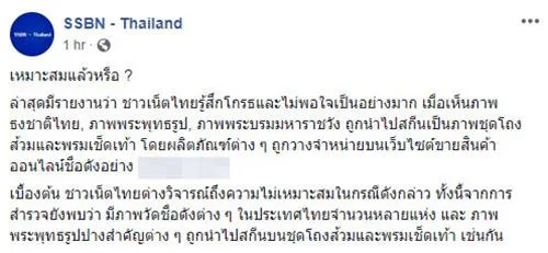 เฟซบุ๊ก SSBN - Thailand มีการโพสต์ภาพเว็บไซต์ขายของออนไลน์เจ้าหนึ่ง มีการขายพรมเช็ดเท้าในห้องน้ำซึ่งเป็นลายธงชาติไทย ลายพระบรมมหาราชวัง แถมพรมดังกล่าวถูกประดับไว้ข้างโถส้วมอีกด้วย