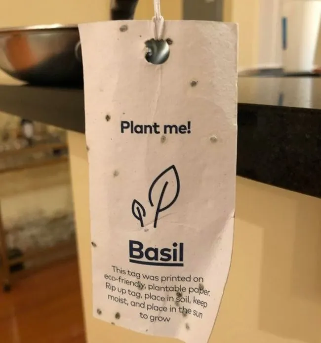 14 “ แท็กกระดาษที่ติดกับกระทะใหม่ของฉันสามารถปลูกเป็นพืชได้”