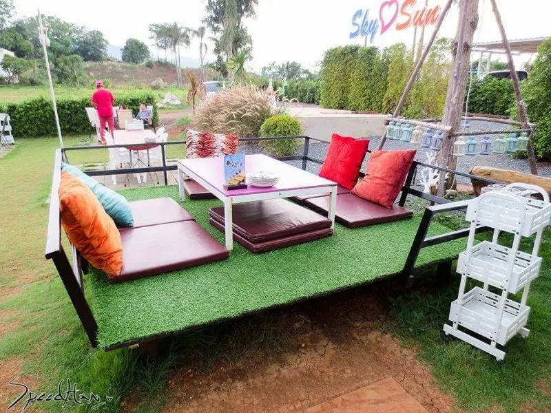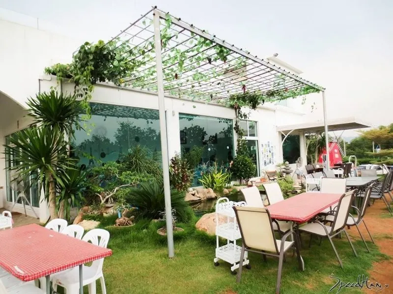 แค่เริ่มต้นจอดรถเห็นบรรยากาศคร่าวๆก็ประทับใจเลยค่ะ ตัวร้านสีขาวตั้งเด่นบนเนินเขา มองดูคล้ายรีสอร์ทเชิงเขา บริเวณด้านนอกเป็นลานหญ้ากว้าง ตกแต่งโต๊ะอาหารน่ารักหลายแบบด้วยกัน มีมุมถ่ายรูปเกร๋ๆรออยู่เพียบ ที่สำคัญช่วงเย็นพระอาทิตย์ตก ถ้าได้นั่งทานอาหารบริเวณด้านนอก บอกเลย "ฟิน" สุดๆ เพราะบรรยากาศยามแสงสีทองตกกระทบไปทั่วบริเวณร้าน จะสวยงามจนเกินห้ามใจเลยทีเดียว