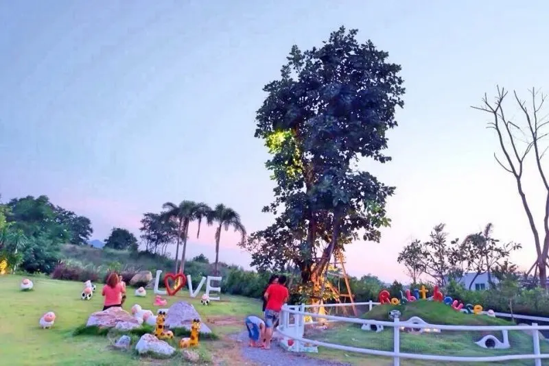 ก่อนเข้าไปด้านในหันไปเห็นโซนด้านข้าง เค้าตกแต่งสนามหญ้า มีบ้านกระต่าย และหุ่นกระเบื้องรูปสัตว์ตัวโตพร้อมรอให้ไปนั่งชิลล์ ถ่ายรูปเช็คอินกันด้วยนะ