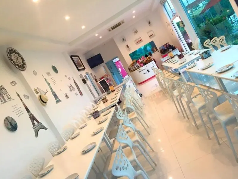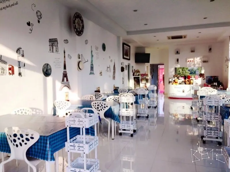 เห็นด้านนอกว่าสวยแล้ว เดินเข้าไปดูด้านใน บอกเลยไม่ผิดหวัง เพราะสวยไม่แพ้กัน ตัวร้านตกแต่งแบบเรียบง่าย ใช้โทนสีขาวทั้งผนังและเฟอร์นิเจอร์ ฝั่งด้านหน้าร้านกรุกระจกใสช่วยให้ร้านดูกว้างขึ้น ส่วนตัวผนังตกแต่งลายอาร์ทเก๋ๆ ไม่เยอะจนเกินไป ให้อารมณ์บ้านที่พร้อมรอทุกคนในครอบครัวมาทานอาหารร่วมกัน ดูอบอุ่นดีค่ะ