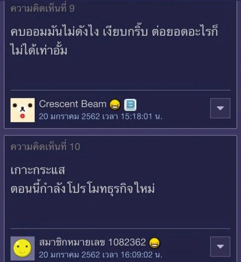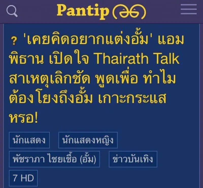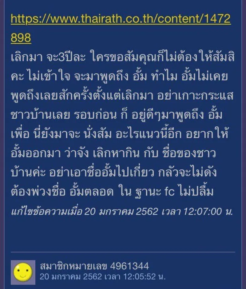 ซึ่งเจ้าของกระทู้ระบุว่า เลิกมา จะ 3 ปีละ ใครขอสัมคุณก็ไม่ต้องให้สัมสิคะ ไม่เข้าใจ จะมาพูดถึงอั้มทำไม อั้มไม่เคยพูดถึงเลยสักครั้งตั้งแต่เลิกมา อย่าเกาะกระแสชาวบ้านเลย รอบก่อนก็อยู่ดี ๆ มาพูดถึงอั้มเพื่อ นี่ยังมาจะนั่งสัมอะไรแนวนี้อีก อยากให้อั้มออกมาว่าจัง เลิกหากินกับชื่อของชาวบ้านค่ะ อย่าเอาชื่ออั้มไปเกี่ยว กลัวจะไม่ดังต้องพ่วงชื่ออั้มตลอด ในฐานะ fc ไม่ปลื้ม