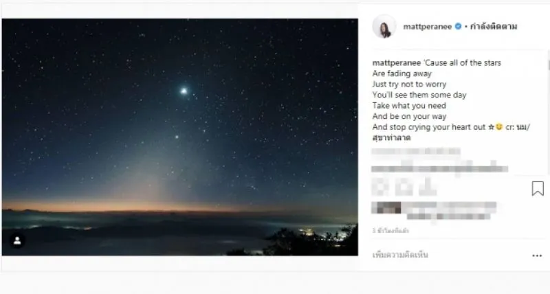ทำให้ล่าสุด แมท ณีรณีย์ ส่อเค้าจะถอดใจรึเปล่า? เพราะอยู่ๆนางก็ลุกขึ้นมาโพสต์ไอจีภาพสุดเศร้า เป็นรูปท้องฟ้ามืดมิดที่มีเพียงดาวดวงเล็กๆส่องแสงพร้อมแคปชั่นภาษาอังกฤษว่า