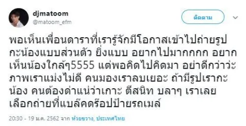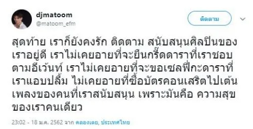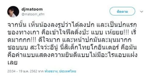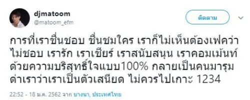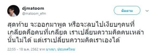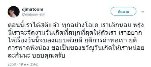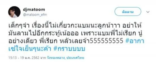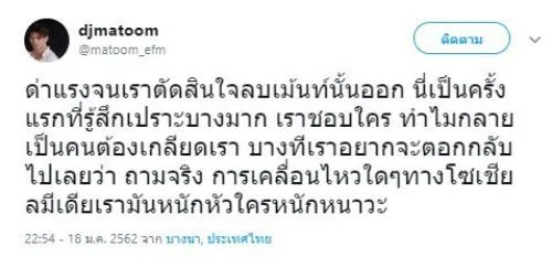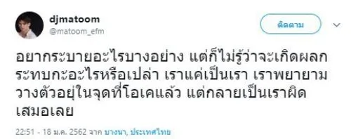 ด้านดีเจมะตูม ก็ทนความนอยด์ไม่ไหว ต้องระบาย โดยดีเจมะตูม ได้ใช้พื้นที่ในทวิตเตอร์ของตัวเอง โพสต์ระบายความอัดอั้นตันใจกับสิ่งที่เกิดขึ้น โดยระบุว่า