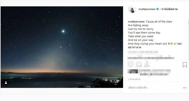 ดราม่าทุกวันไม่มีหยุดพัก เหตุเพราะ”รักพ่อหม้าย”แท้ๆ… ทำให้ล่าสุด แมท ณีรณีย์ ส่อเค้าจะถอดใจรึเปล่า? เพราะอยู่ๆนางก็ลุกขึ้นมาโพสต์ไอจีภาพสุดเศร้า เป็นรูปท้องฟ้ามืดมิดที่มีเพียงดาวดวงเล็กๆส่องแสงพร้อมแคปชั่นภาษาอังกฤษว่า
