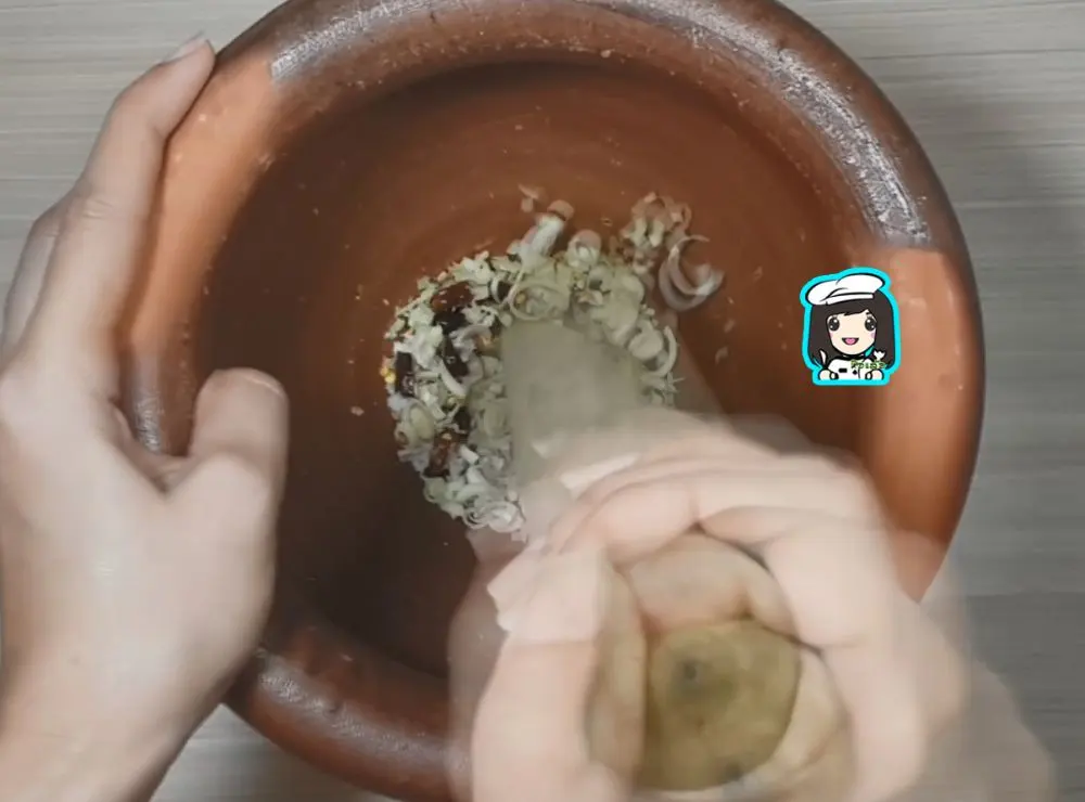 1.นำพริกแห้งไปแช่น้ำ พอนิ่มดีแล้ว หั่นเป็นท่อนสั้นๆ ซอยตะไคร้ ฝานกระเทียม หอมแดง นำมาโขลกใส่เกลือลงไป โขลกให้เกือบละเอียด พักไว้
