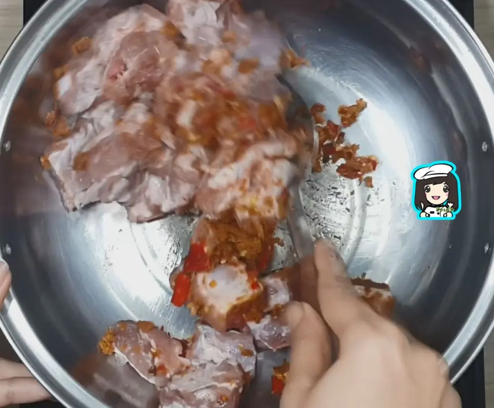 3.นำหม้อตั้งเตา ใส่กระดูกหมูและพริกแกงที่โขลกไว้ลงไป คลุกเคล้าพอเข้ากัน